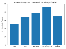Gemäss der vom Institut Demoscope durchgeführten, repräsentativen Umfrage sprechen sich lediglich 17 % der Stimmberechtigten gegen einen Beitritt zum TPNW aus, weitere 12 % sind unentschieden.